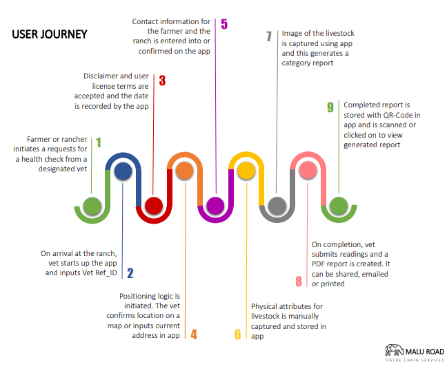 Malu Roads’ offer and promise of continuity of care is made possible by leveraging a repository of digital tools and mobile applications, making it possible to continue treatment from where the last vet inspection stopped. Thus, effectively offering the prospect of leveraging a network of vets and their livestock healthcare reporting as the starting point for the next visit and guaranteeing continuity.